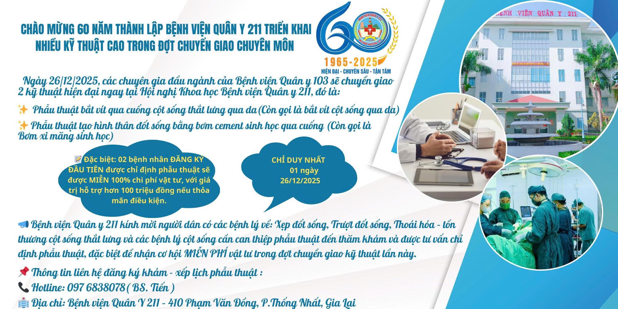 Bệnh viện Quân y 211 kính mời người dân có nhu cầu đến khám và được tư vấn chỉ định phẫu thuật, đặc biệt để nhận cơ hội miễn phí vật tư trong đợt chuyển giao kỹ thuật lần này.