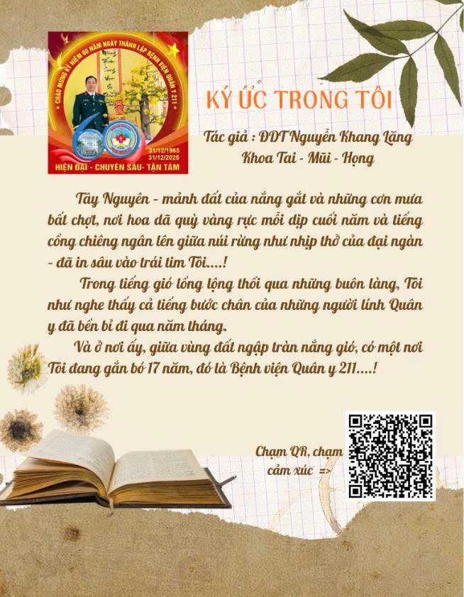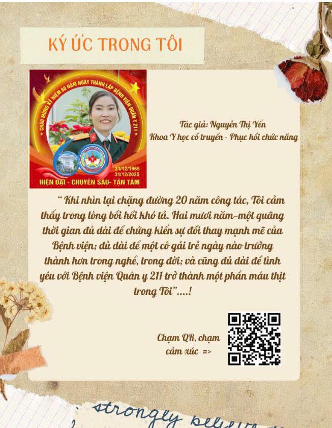 Fanpage Bệnh viện Quân y 211 xin trân trọng giới thiệu chuỗi bài viết chia sẻ những cảm xúc chân thành của cán bộ – nhân viên về những ngày đầu gắn bó, những ca trực đêm đầy thử thách, những khoảnh khắc trưởng thành và cả tình yêu da diết dành cho mái nhà 211. Mỗi câu chuyện là một lát cắt của lịch sử. Mỗi ký ức là một ngọn lửa truyền cảm hứng cho thế hệ hôm nay và mai sau.