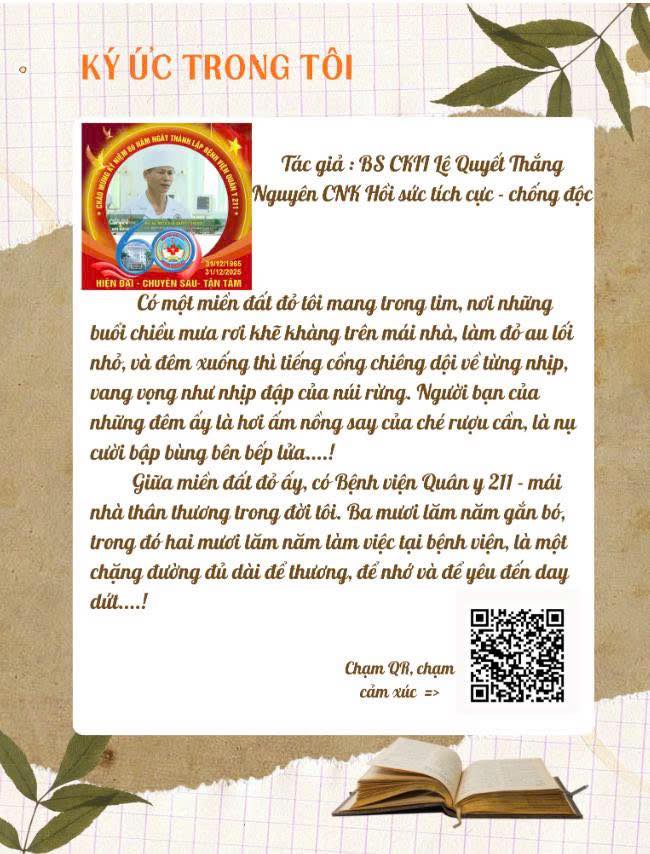 Hãy cùng đón đọc và lan toả những bài viết đầy cảm xúc này. Hy vọng những dòng ký ức sẽ chạm vào trái tim bạn – như cách bao thế hệ “chiến sĩ áo trắng” đã chạm vào trái tim người bệnh suốt 60 năm qua. Cùng nhau viết tiếp những trang sử mới – vì một Bệnh viện Quân y 211 Anh hùng, Hiện đại - Chuyên sâu - Tận tâm