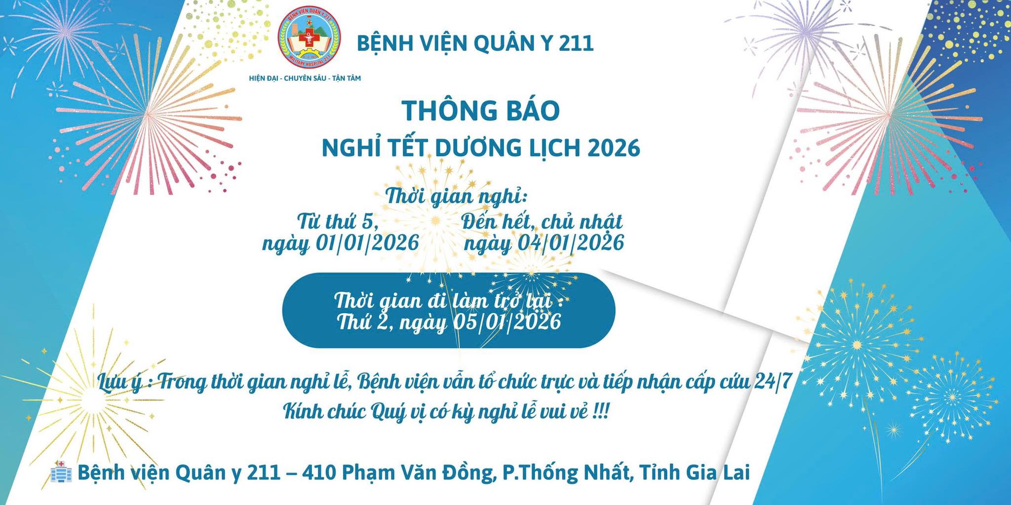 Bệnh viện Quân y 211 trân trọng thông báo thời gian nghỉ Tết Dương lịch năm 2026 như sau: